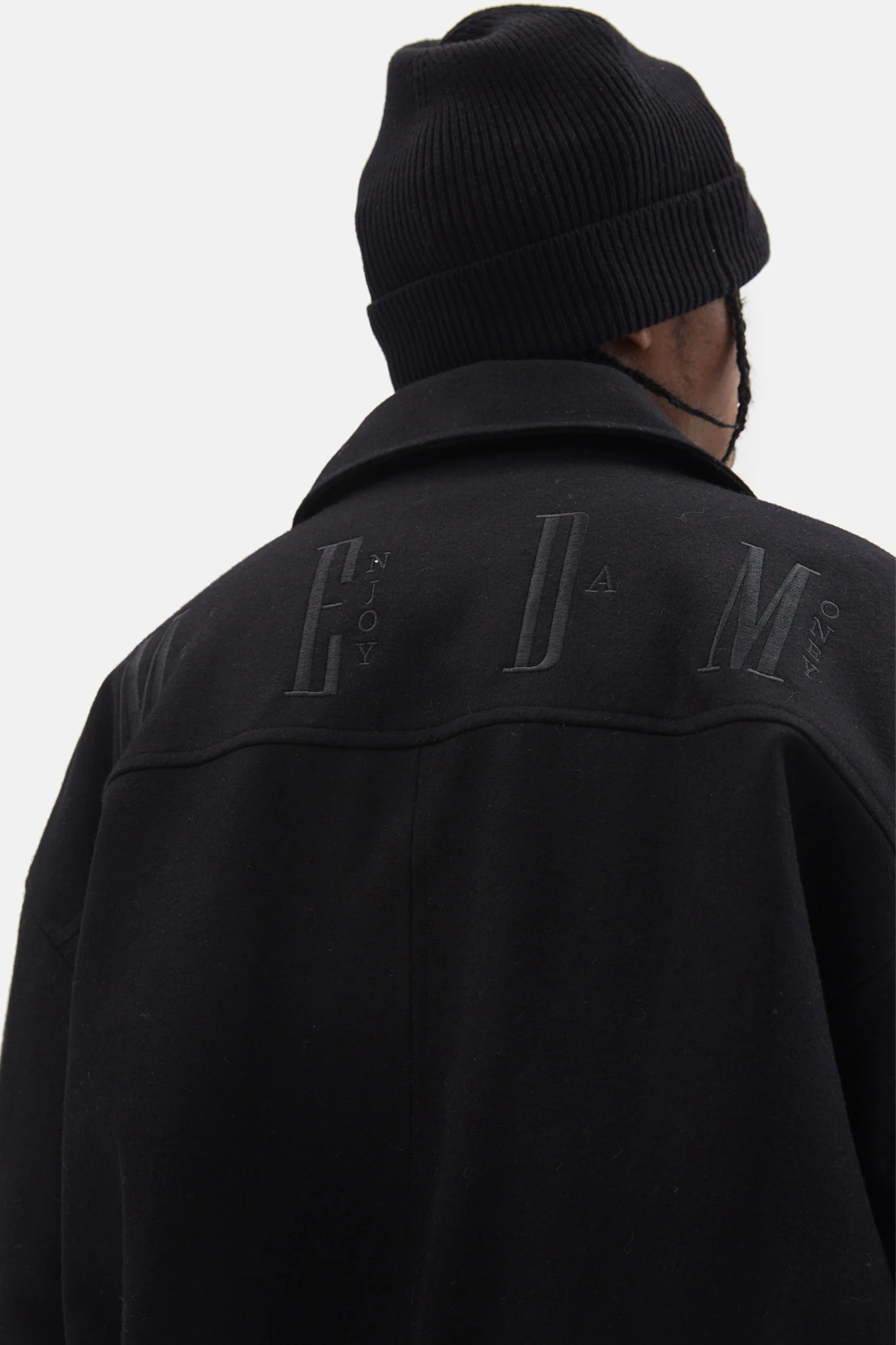 this Jacket features embroidered logo at front and the back. Zip up closure with pointed collar.