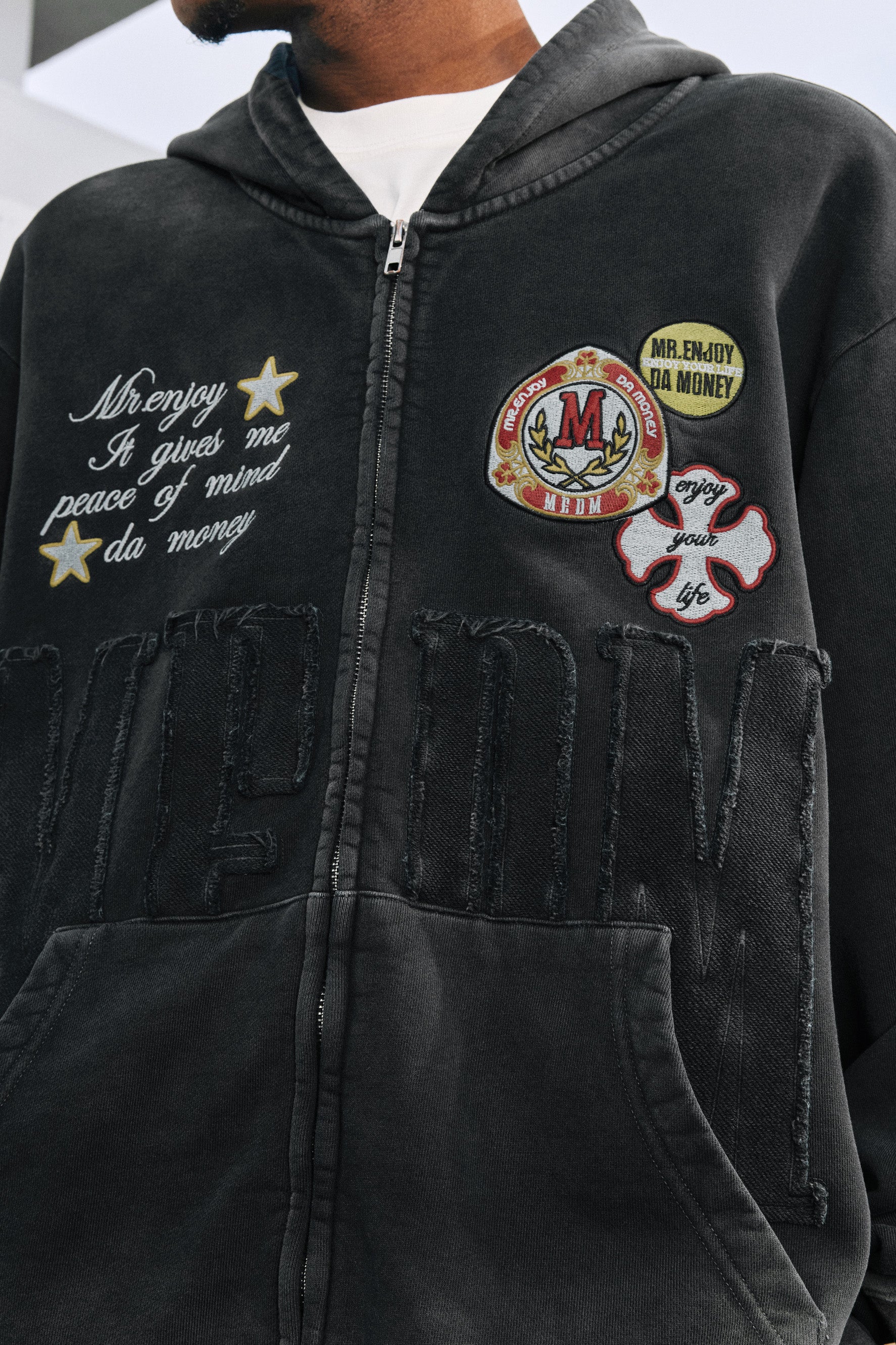 This MEDM SHIELD BADGE HOODIE is made with organic cotton, resulting in a more sustainable and eco-friendly option. The shield badge patches add a unique touch to the design, while the zip-up closure and two side pockets provide convenience and practicality. The washed effect gives it a stylish and vintage look. Expertly crafted for both comfort and style.