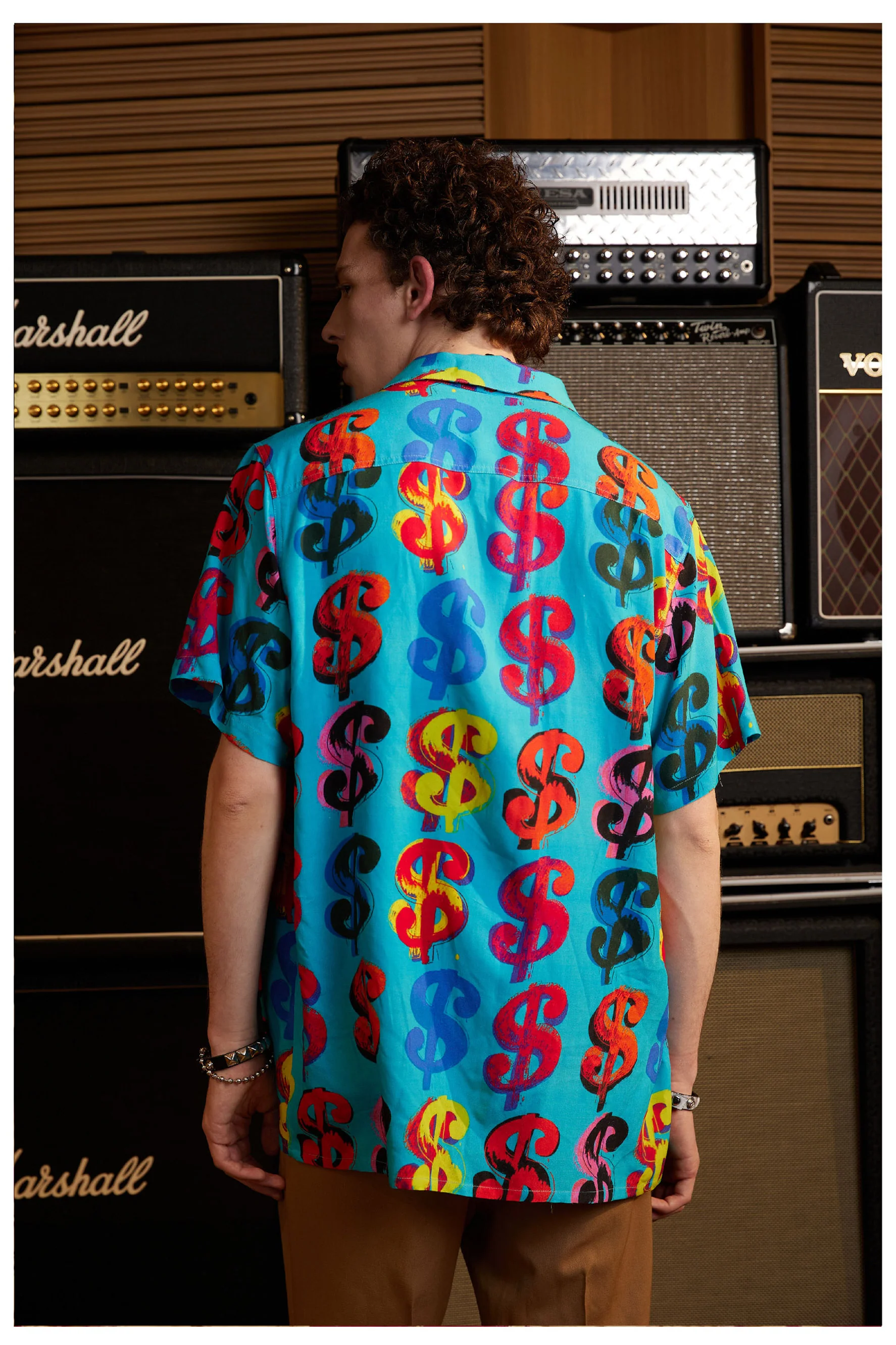This shirt features dollar aloha print throughout, button up closure. Relaxed fit