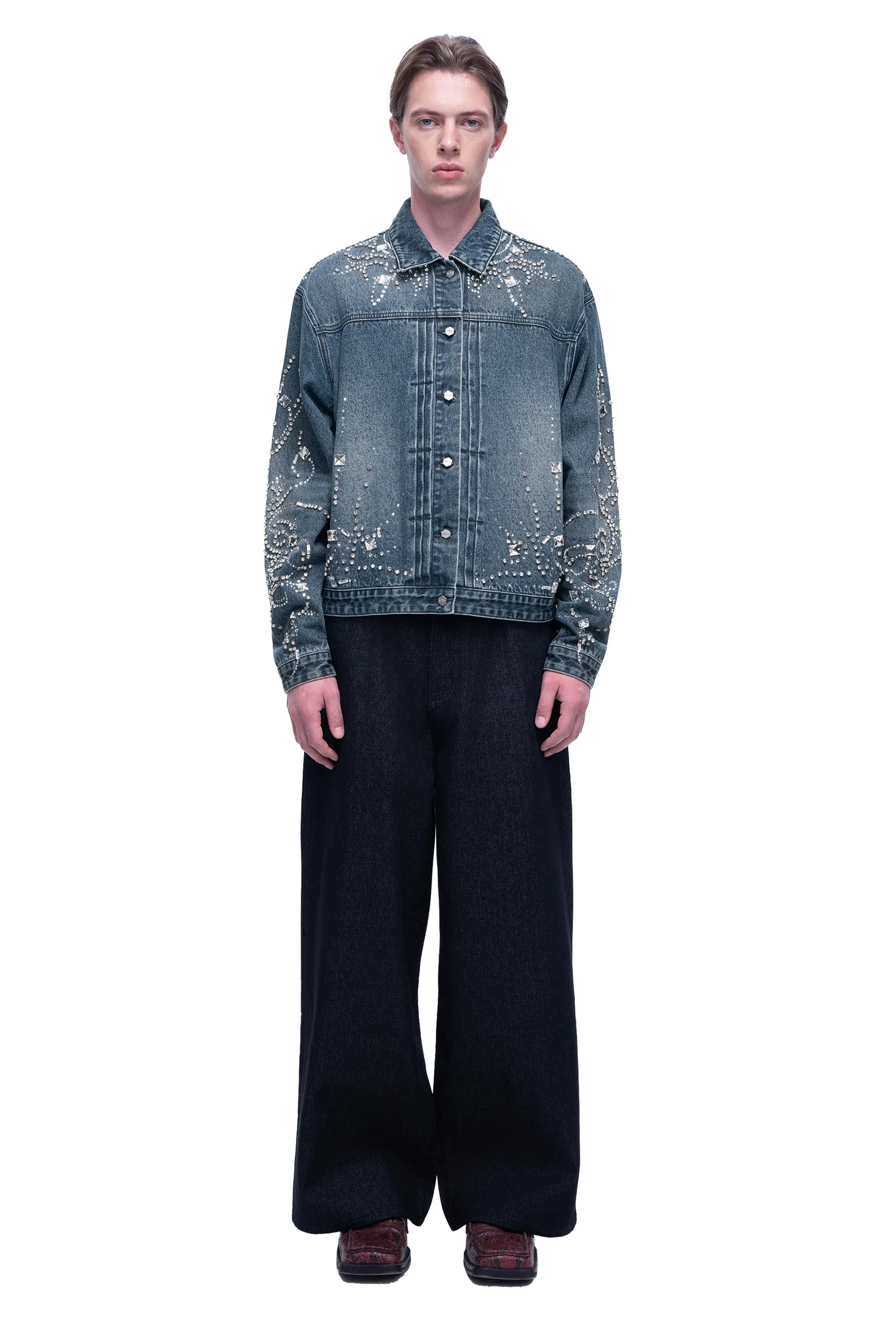 TBHNP Luminous Cropped Jacket features a premium cotton-blend fabric with regenerated cellulose and polyester for optimal comfort and durability. The garment showcases a distressed wash combined with monkey wash techniques, enhanced by hot-fix and hand-sewn rhinestones for striking visual impact. Custom metal tack buttons on the front placket add refined detailing, while a custom metal leather patch at the back waist delivers authentic craftsmanship. This expertly constructed piece merges contemporary styling with luxurious embellishments, making it an essential statement layer for discerning wardrobes.