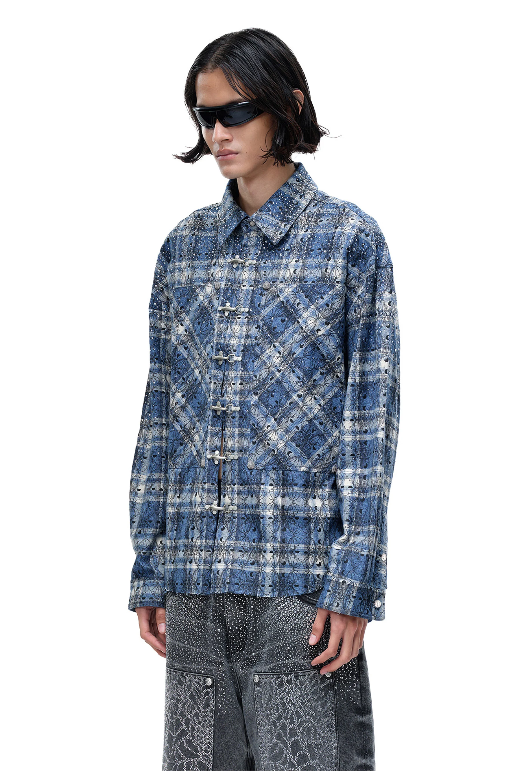 This organic cotton shirt features a bold rhinestone design on the front and back, adding a touch of glamour to its classic plaid pattern. With a convenient buckle closure, this shirt not only looks great, but also provides a comfortable and practical wear. Elevate your style with TBHNP's Rhinestone Shirt.