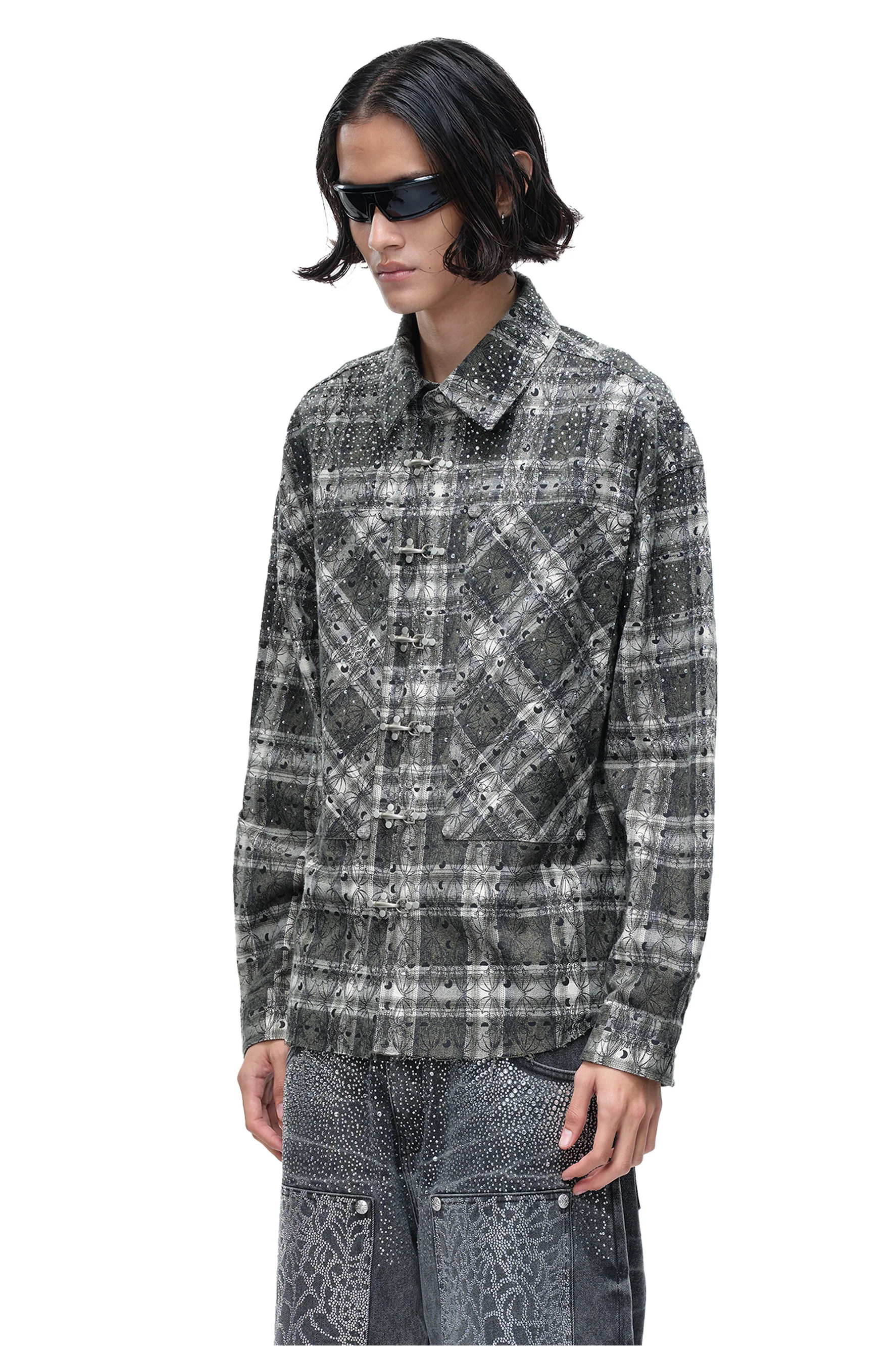 This organic cotton shirt features a bold rhinestone design on the front and back, adding a touch of glamour to its classic plaid pattern. With a convenient buckle closure, this shirt not only looks great, but also provides a comfortable and practical wear. Elevate your style with TBHNP's Rhinestone Shirt.