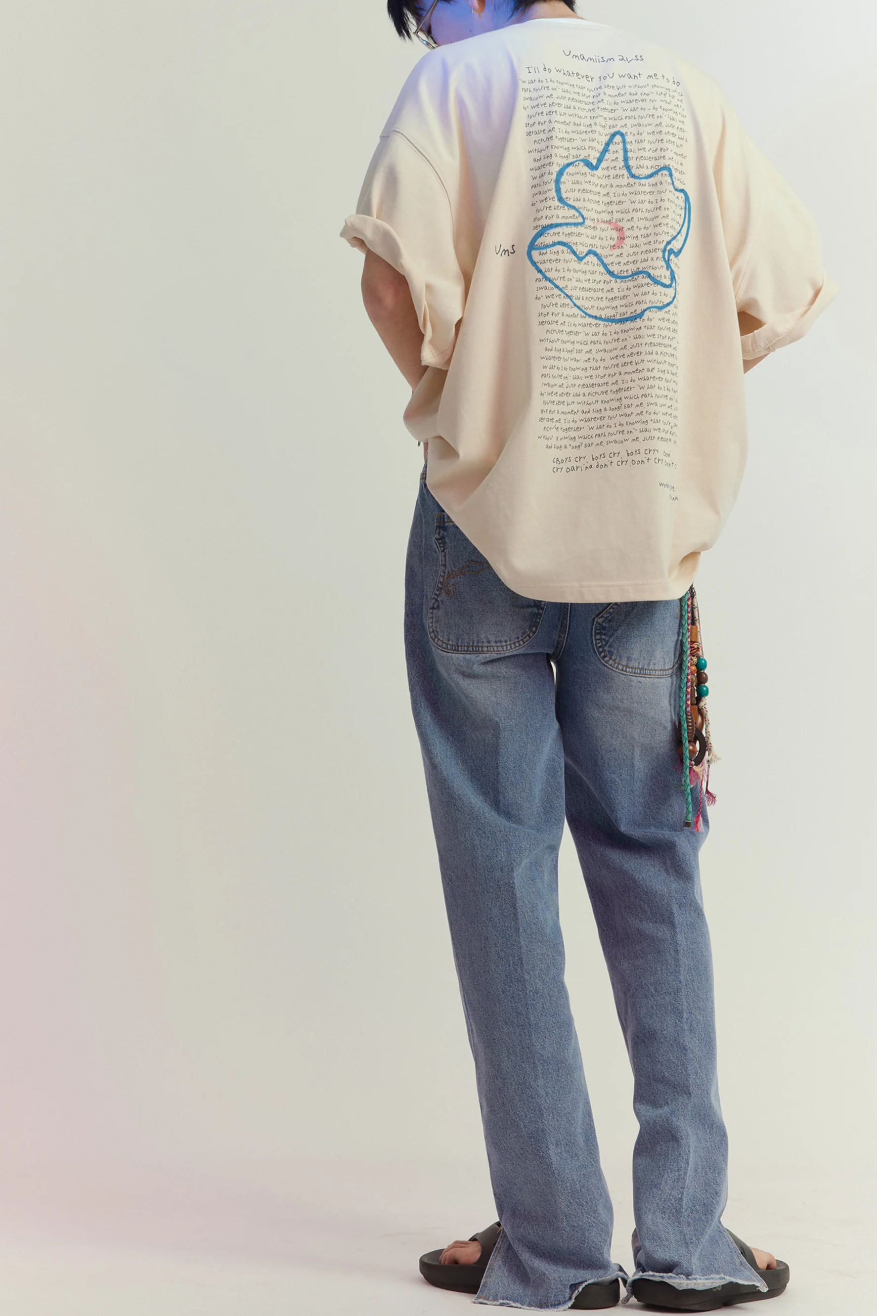 These jeans feature a relaxed fit, straight leg with hand-painted words