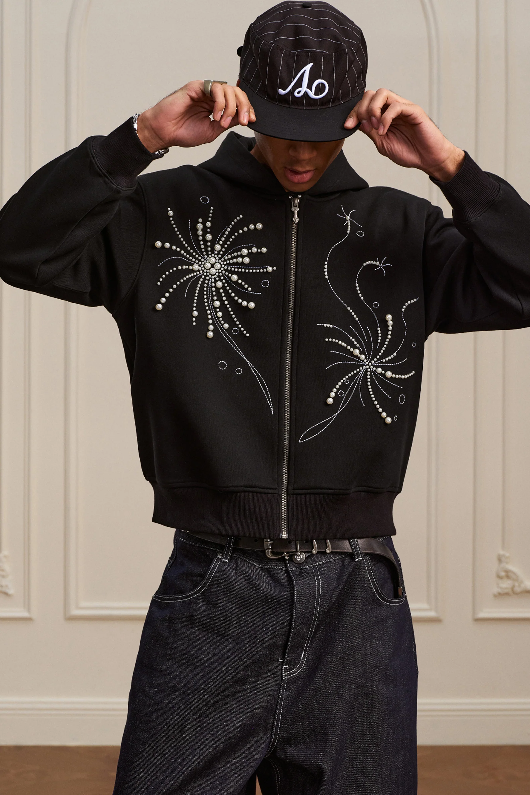 Crafted from a premium cotton-polyester blend, this hoodie delivers superior comfort and durability for everyday wear. The standout fireworks pearl embroidery creates an eye-catching focal point with dimensional texture and refined detail. A full zip-up closure provides versatile styling options—wear it open as a layer or zipped for complete coverage. The thoughtful construction ensures the garment maintains its shape and appearance through repeated wear and washing, making it a reliable addition to any wardrobe.