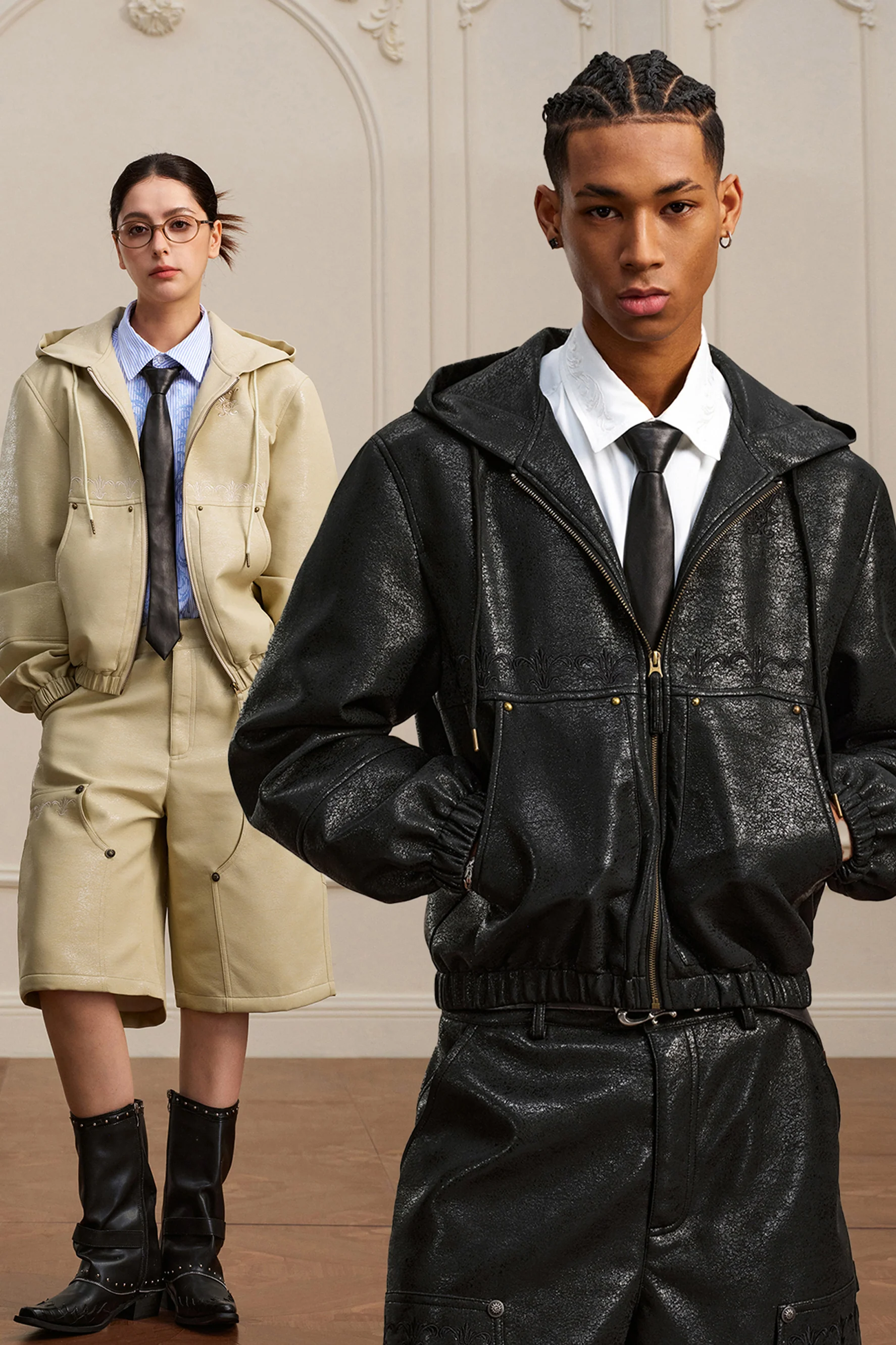 YADCREW GLITTER HOODED LEATHER JACKET