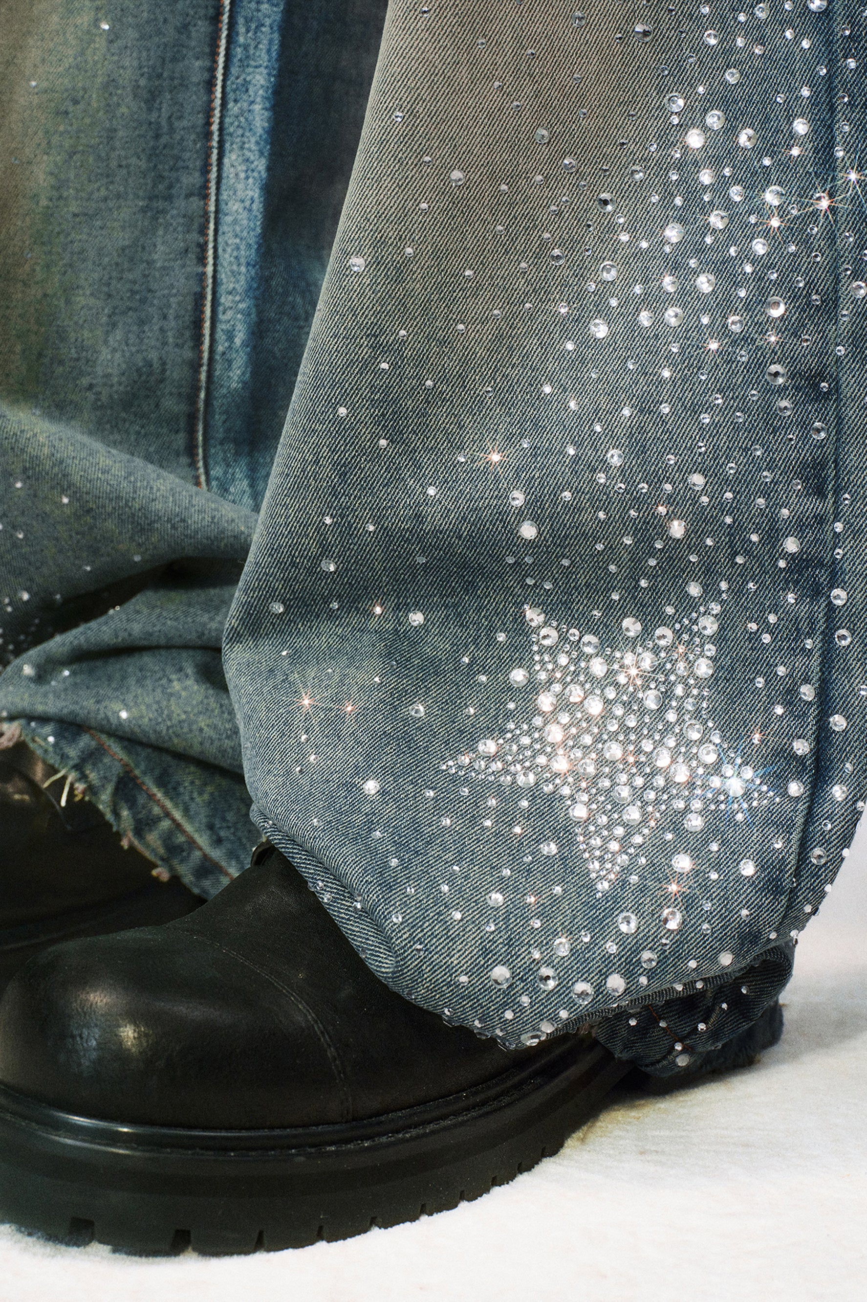 YADCREW RHINESTONE WASHED JEANS Crafted from a sustainable blend of organic cotton and cellulose, these jeans deliver both comfort and environmental consciousness. Crystals are meticulously embedded throughout the design, creating an eye-catching embellished aesthetic. The relaxed silhouette provides effortless wearability, while the intentional washed finish and subtle distressing at the hem add contemporary character. Perfect for those seeking a statement piece that balances quality materials with distinctive style.