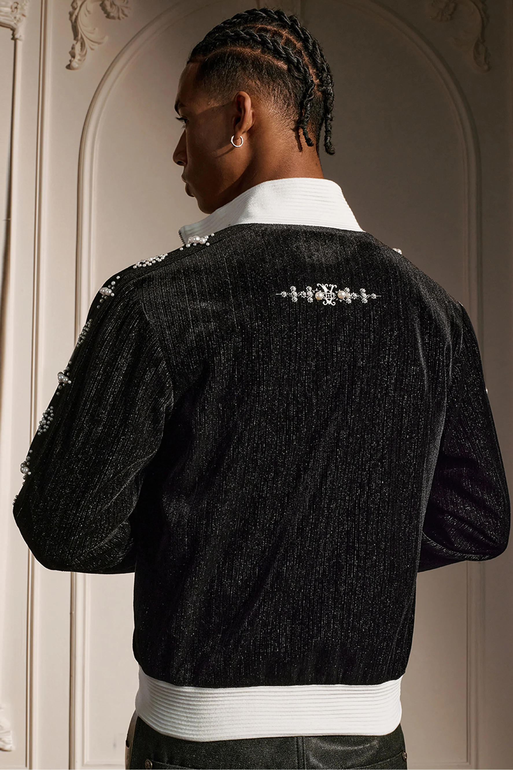 This sophisticated velvet jacket combines luxurious texture with refined detailing. The pearl embellishments adorning both sleeves add an elegant focal point, while the convenient zip-up closure ensures effortless styling. Elastic ribbed collar and hem provide a tailored fit that moves with you, and dual side pockets offer practical functionality. Crafted from durable polyester, this piece transitions seamlessly from casual to elevated occasions.